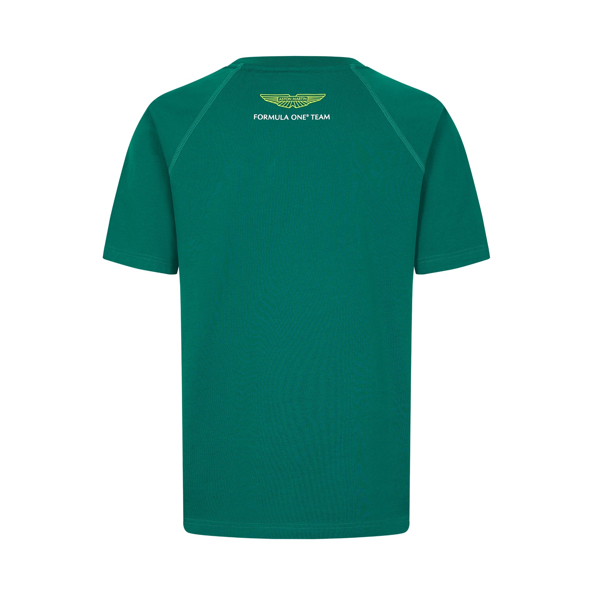 Classic crew neck AMF1 tee shirt with Aston Martin Aramco F1 Team front patch and Aston Martin Wings graphic on the back. Available in Team Green, Lime or White. Made from Organic Cotton