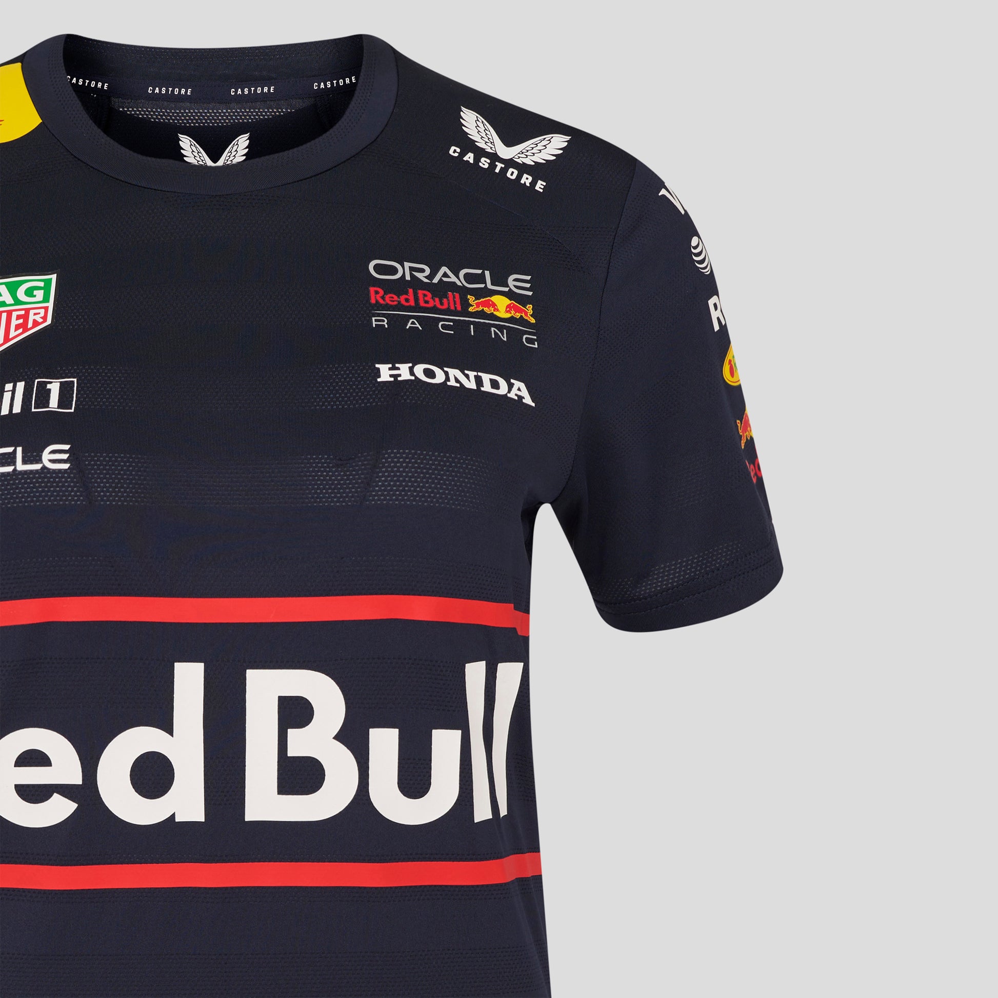 Oracle Red Bull Replica F1 Set Up Tee Shirt. Womens set up tee, the front features the Red Bull team banner, ORBR team Logo and Tag Heuer official sponsor badge. The back of the polo shirt features the iconic charging Bulls logo.