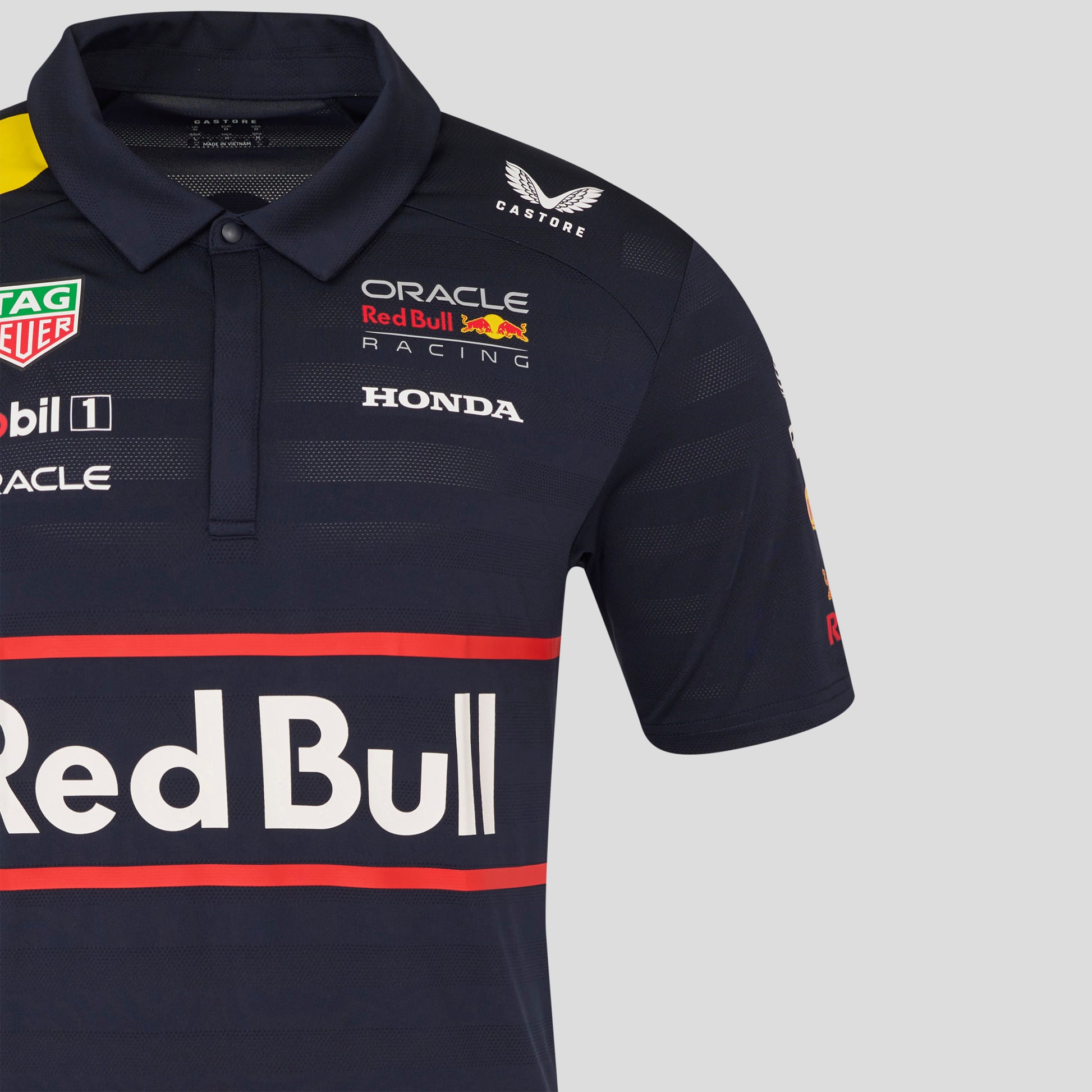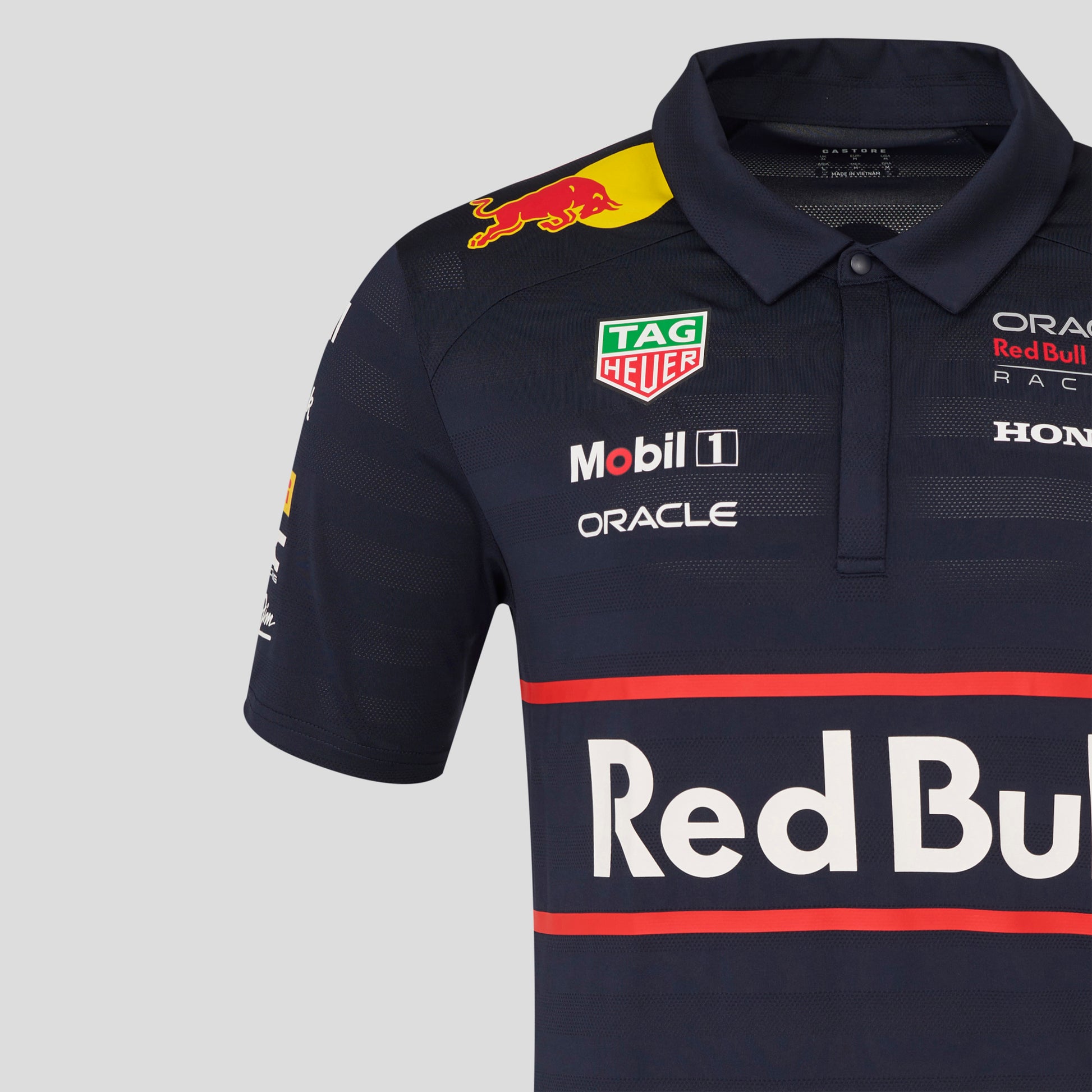Oracle Red Bull Replica SS Polo Shirt. Mens Polo Shirt the front features the Red Bull team banner, ORBR team Logo and Tag Heuer official sponsor badge. The back of the polo shirt features the iconic charging Bulls logo.