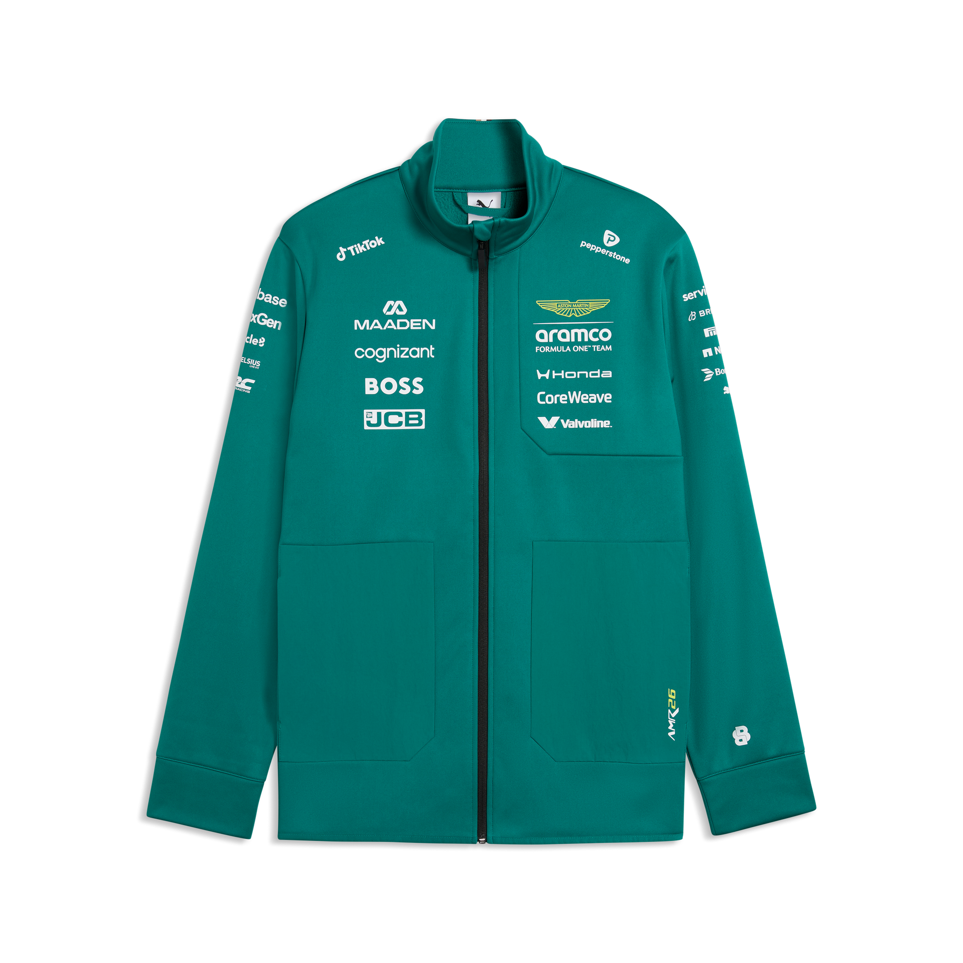 Support the Aston Martin Aramco Formula One® Team in style with the official Aston Martin F1 Team 2026 Softshell Jacket for Men. Finished in the signature Green Lux colour, this Softshell Jacket features authentic team branding inspired by the 2026 season, delivering a smart and professional look for all fans of the Silverstone based team.