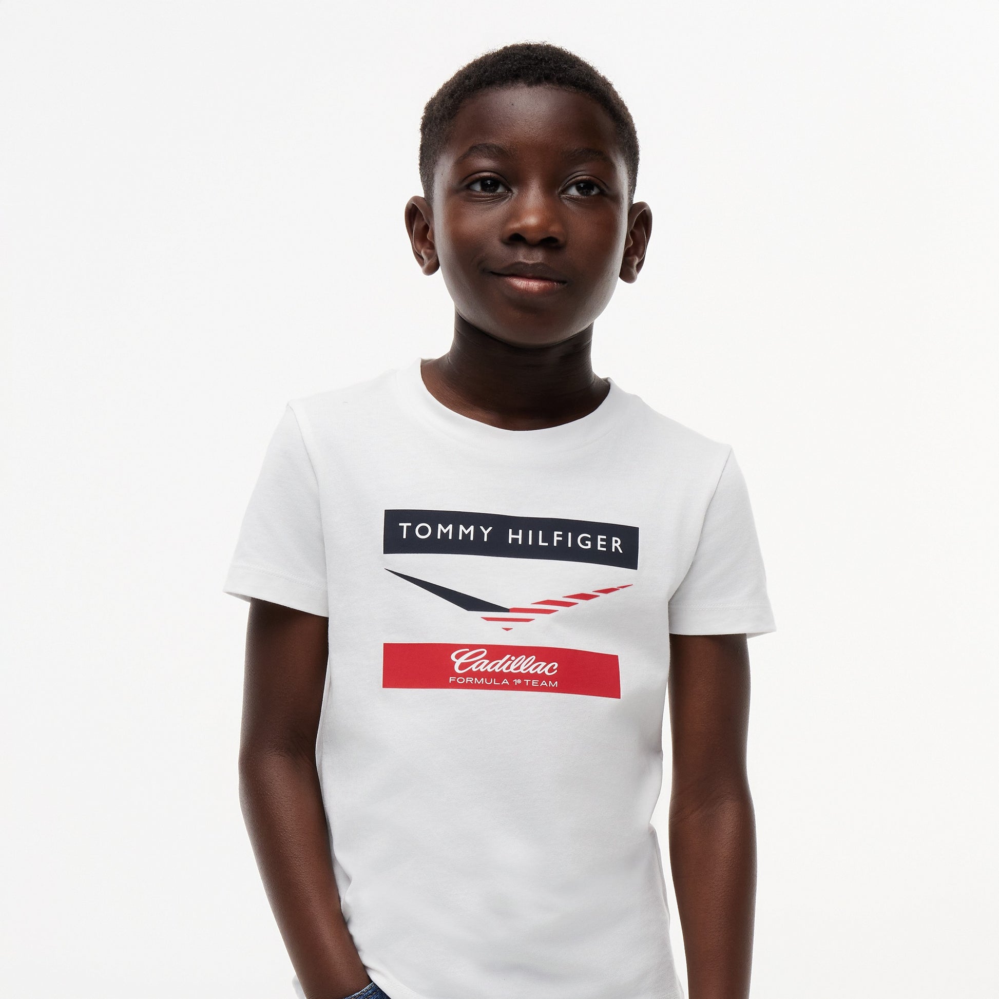 Get young fans ready for race day with the Cadillac F1 x Tommy Hilfiger Chevron T‑Shirt for Kids in crisp white. This premium kids’ tee blends American motorsport‑inspired style with iconic Tommy Hilfiger design for standout casual appeal.