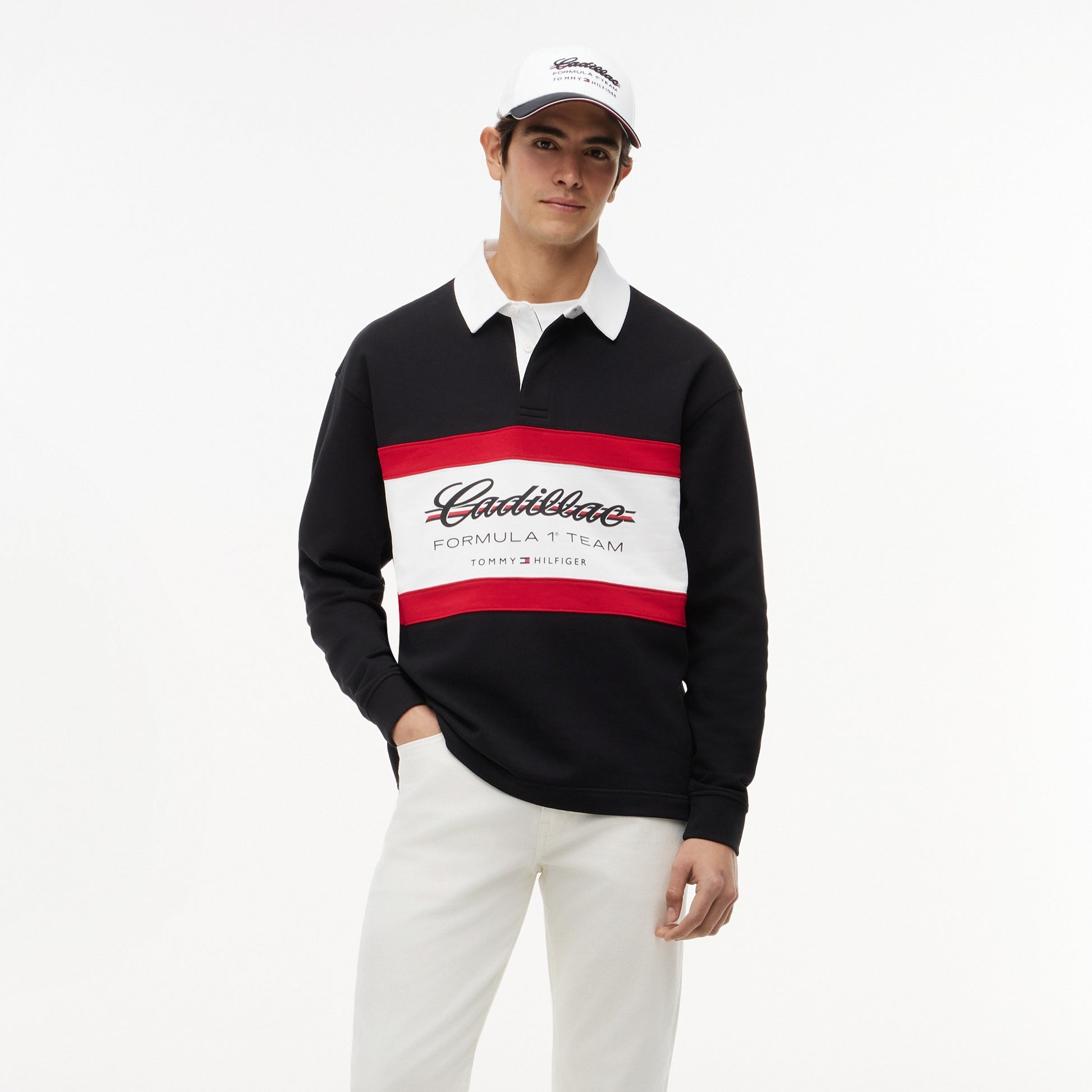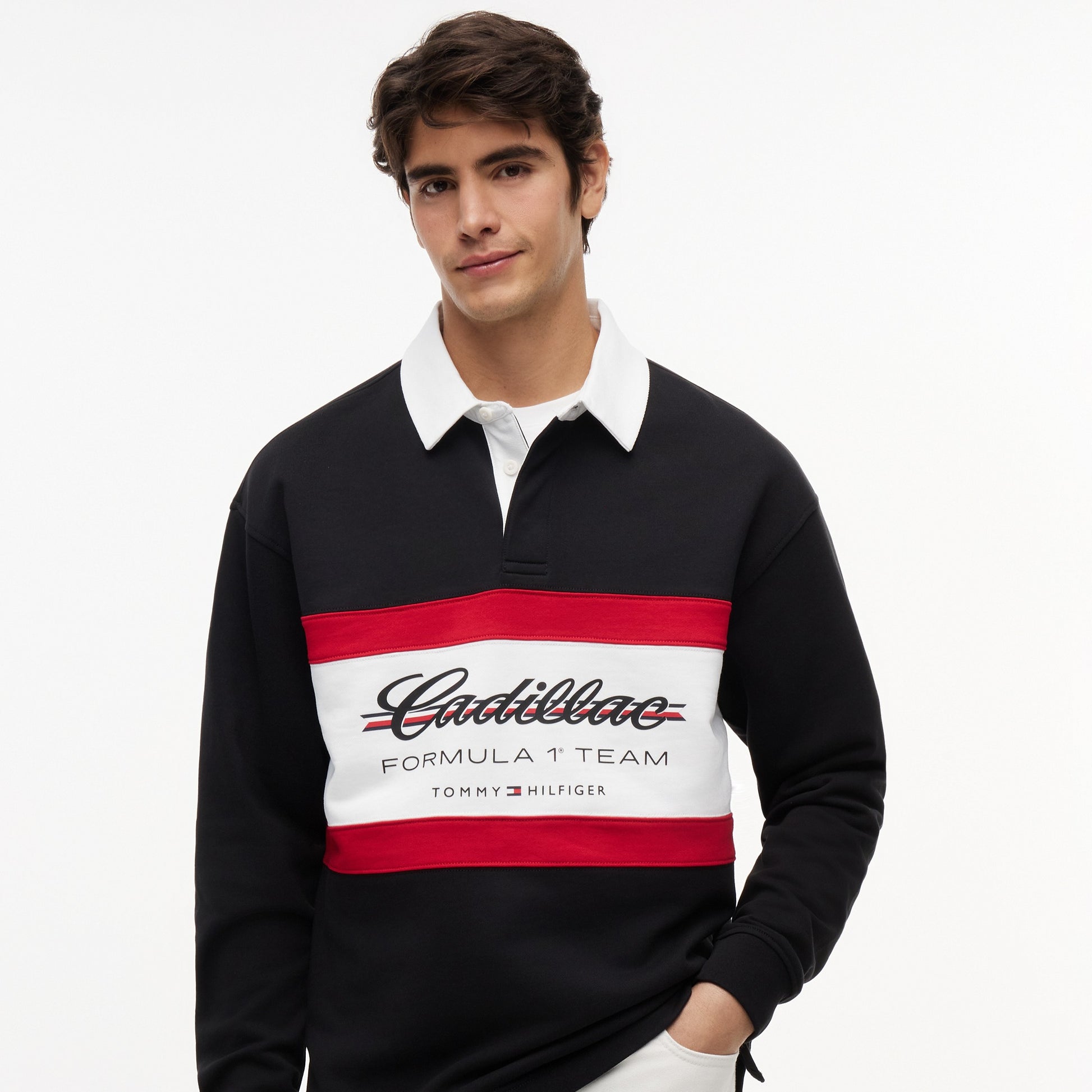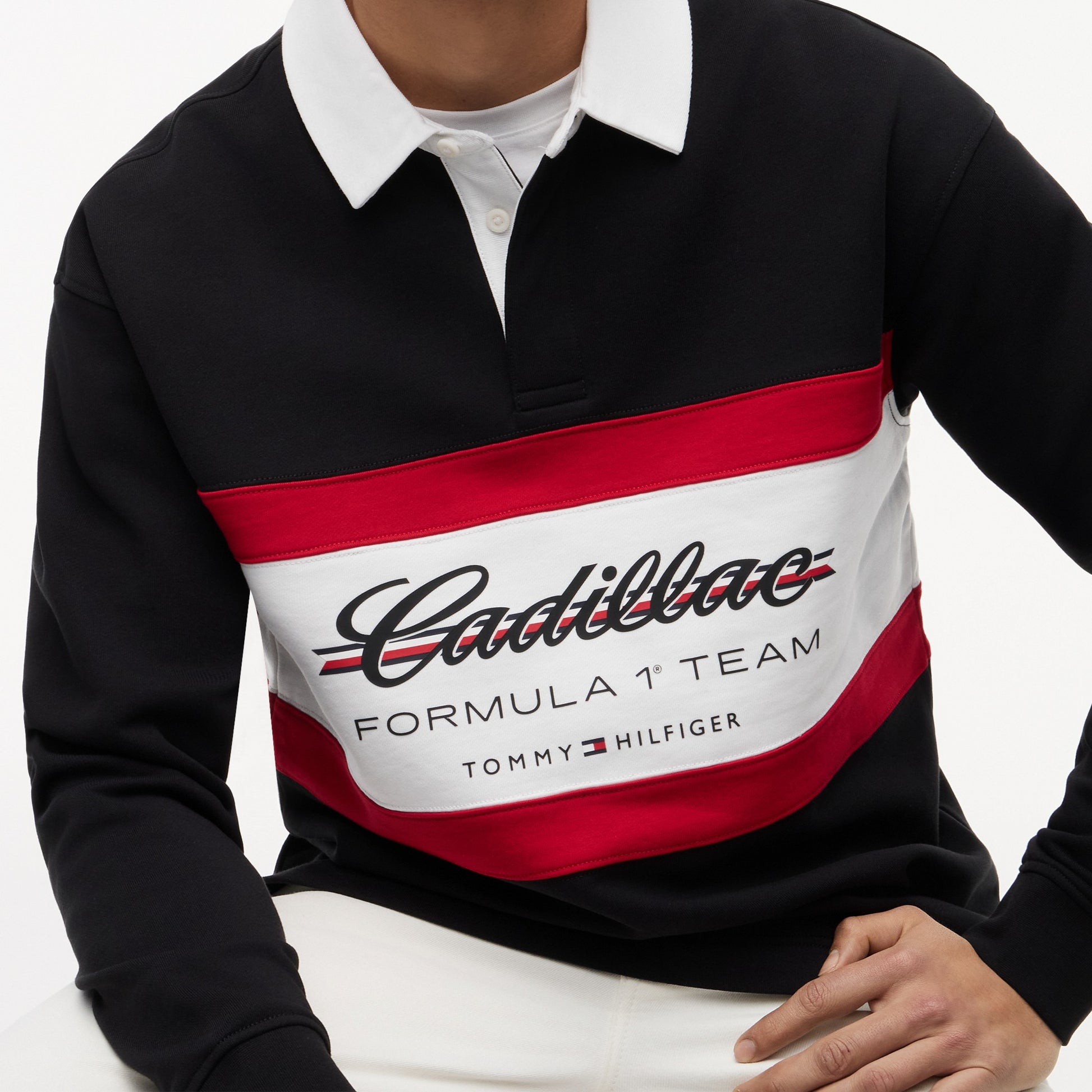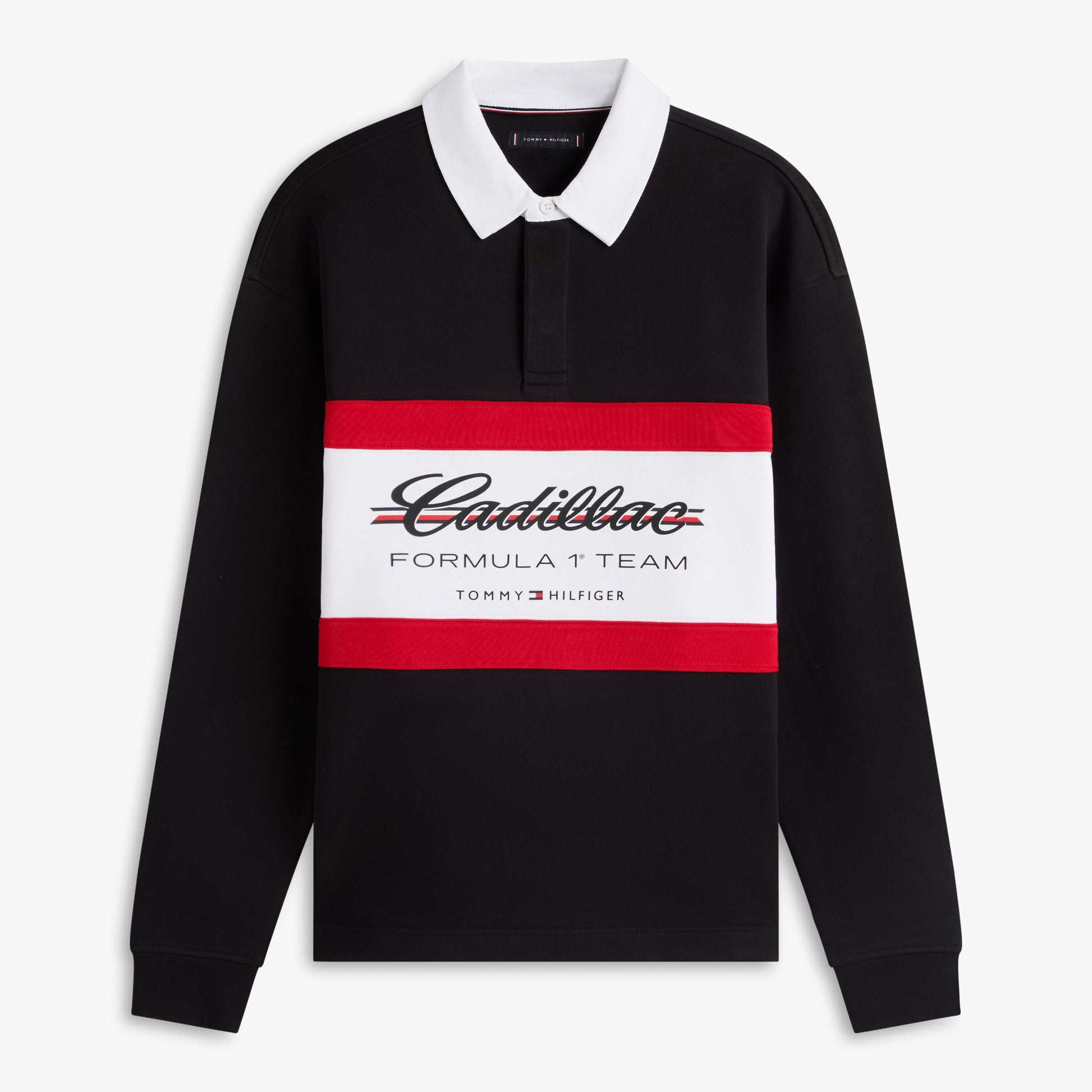 Show your motorsport style with the Cadillac F1 x Tommy Hilfiger Panelled Rugby for Men in classic black. This premium men’s rugby shirt combines bold panelled design with iconic Tommy Hilfiger x Cadillac Formula 1 Team branding for a standout athletic look.