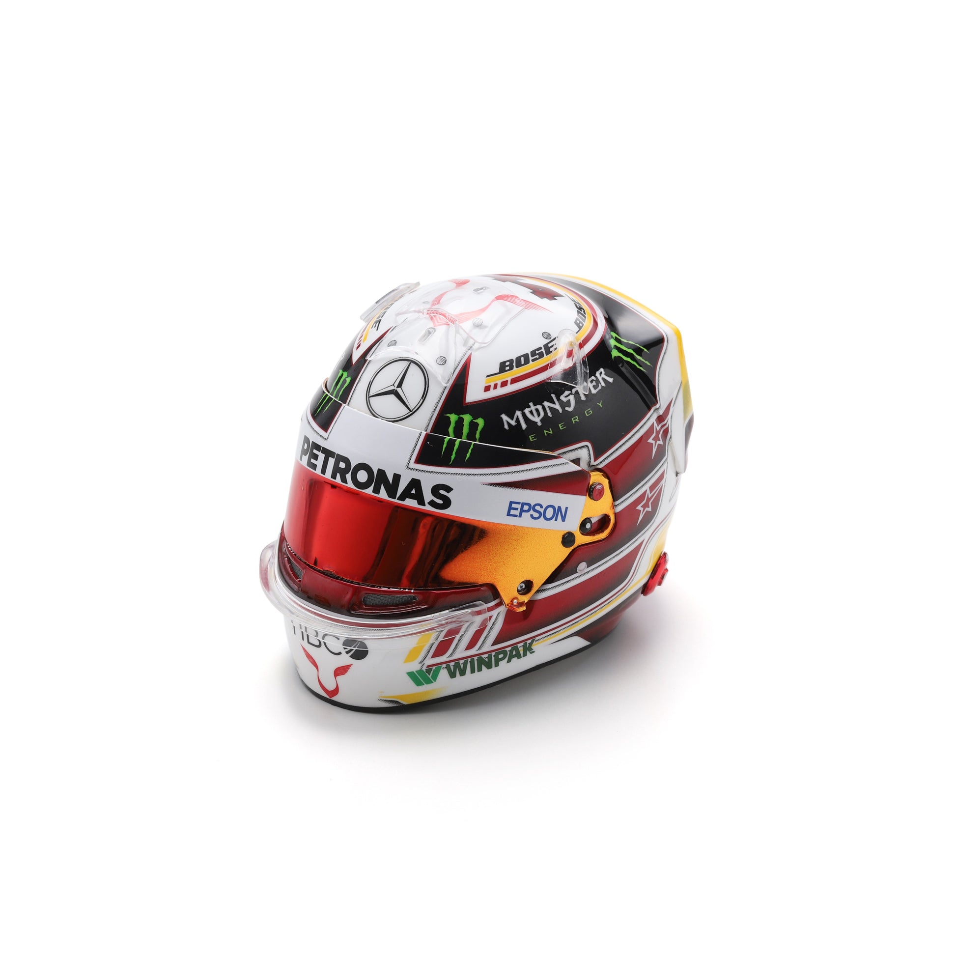 Mark a legendary moment in Formula 1 history with this 1:5 scale Spark mini helmet, a faithful replica of the helmet worn by Lewis Hamilton during the 2018 Mexican Grand Prix, where he secured his 5th World Championship title.